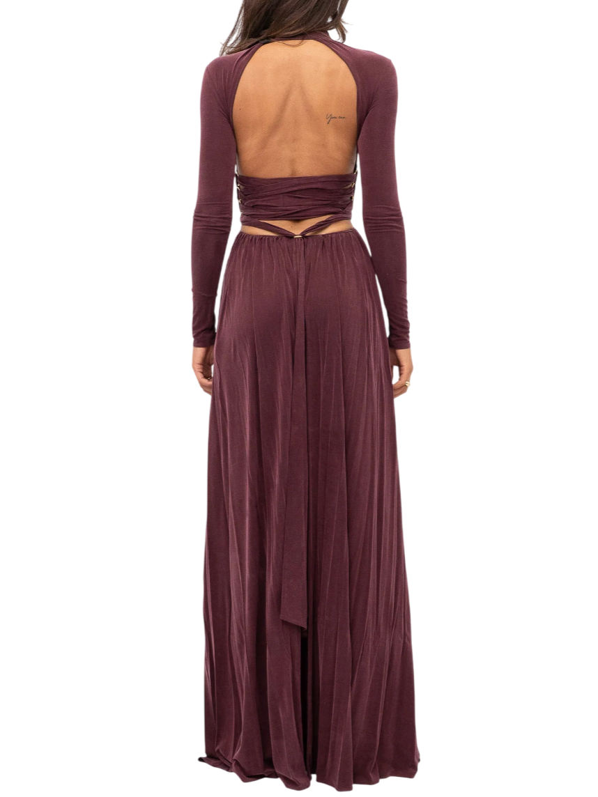 L'abito presenta una lavorazione plissè che dona movimento e fluidità alla silhouette. La sua apertura profonda sul davanti, insieme a un colletto drappeggiato decorato da bottoncini in galvanica dorata, conferisce un tocco di sofisticata raffinatezza. Le maniche lunghe offrono una protezione elegante, mentre la schiena scoperta, arricchita da un'allacciatura incrociata, aggiunge un elemento di seduzione.