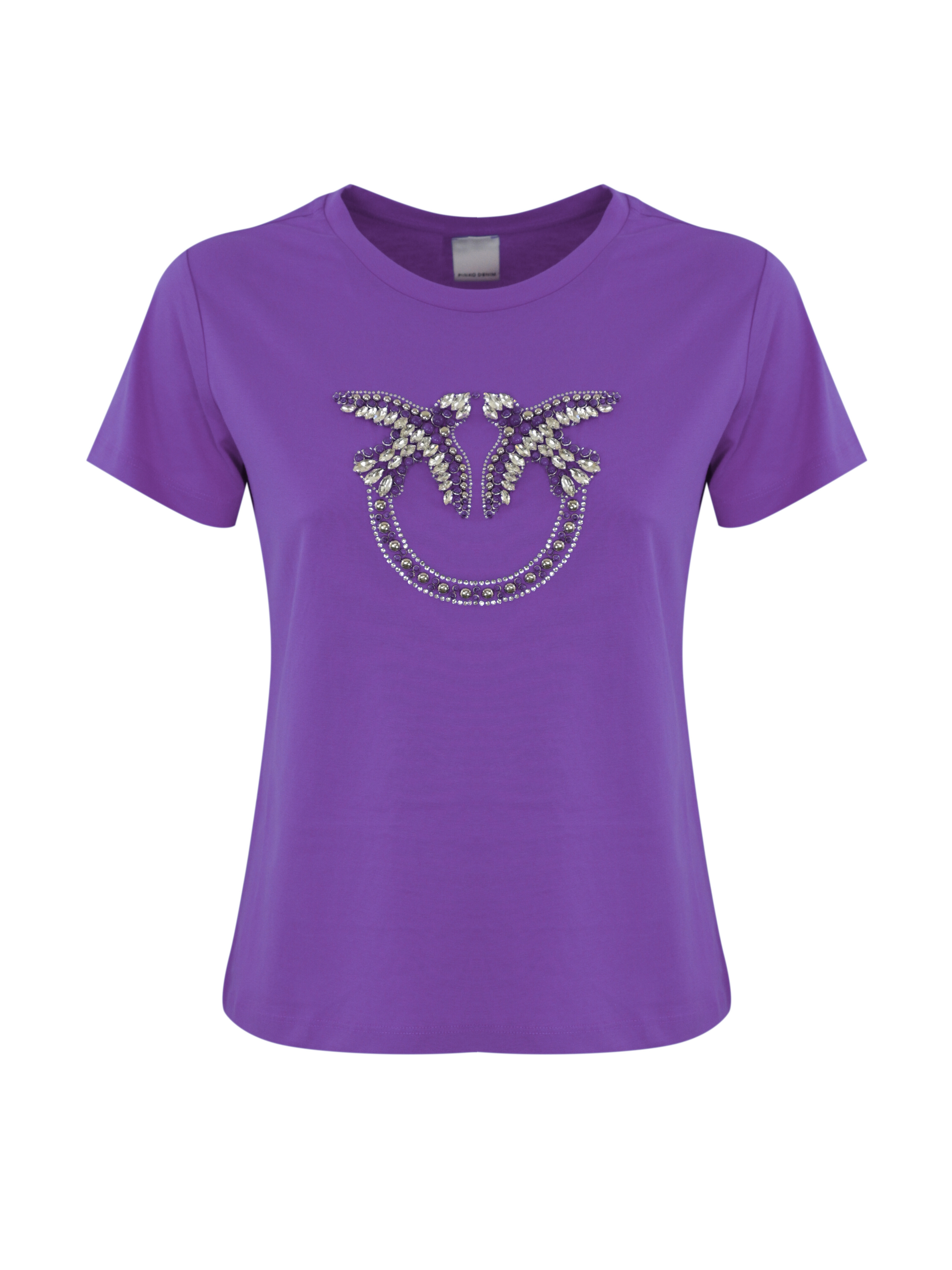 Il design è caratterizzato da maniche corte, rendendo questo capo perfetto per ogni occasione, sia casual che più formale. La vera protagonista di questa T-shirt è il maxi logo Love Birds, un elemento distintivo di Pinko, arricchito da applicazioni gioiello tono su tono che catturano la luce e aggiungono un tocco di lusso al vostro look.