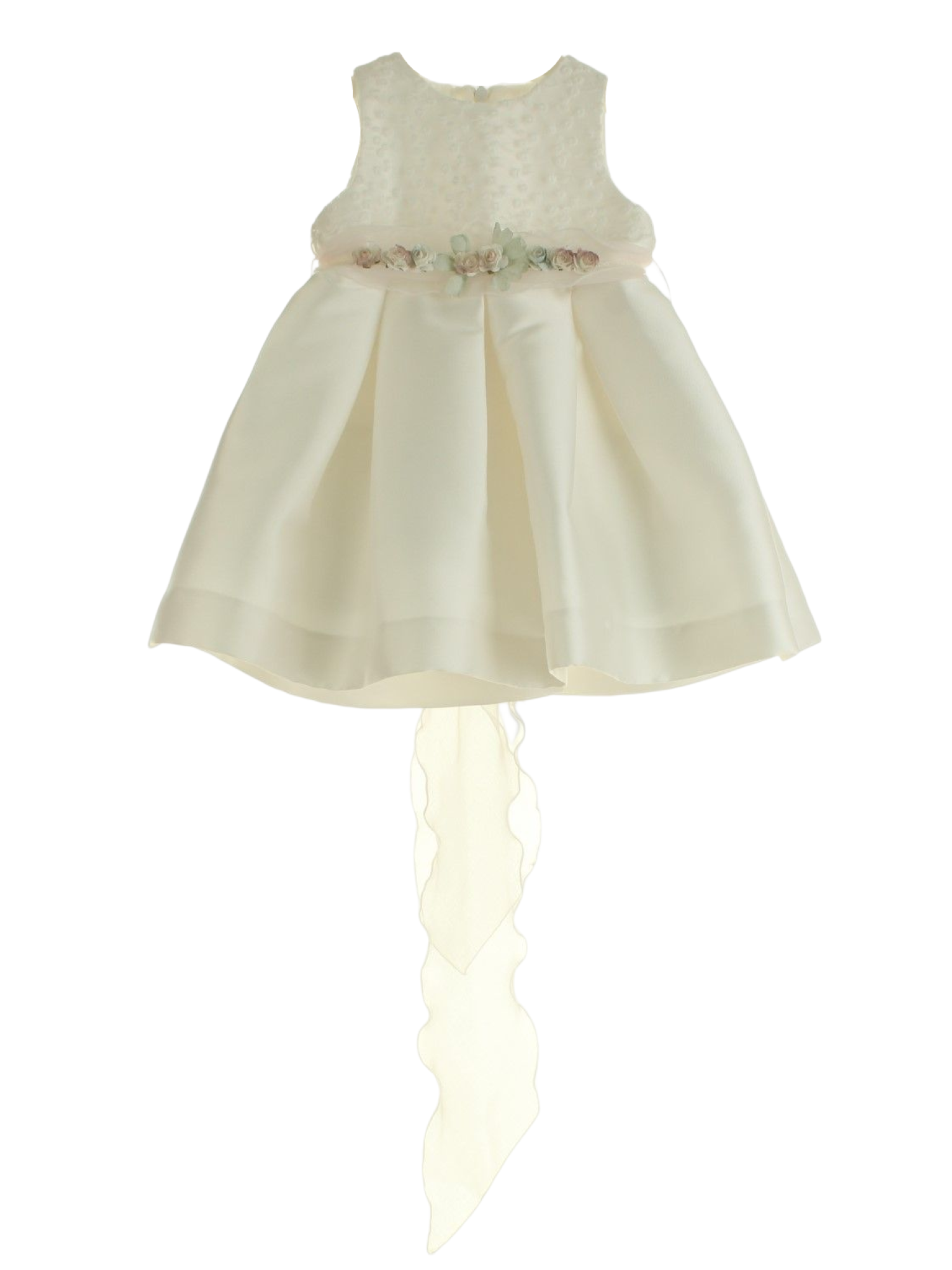 La gonna ampia è caratterizzata da pinces sotto la vita, creando un effetto voluminoso e sontuoso, grazie anche agli strati interni con inserti in tulle. Questo particolare dettaglio rende ogni movimento della vostra bimba un vero spettacolo di grazia. La cintura in organza, abbellita da una passamaneria in macramè con decorazione floreale, si annoda con un elegante fiocco sulla parte posteriore, aggiungendo un ulteriore elemento di charme.